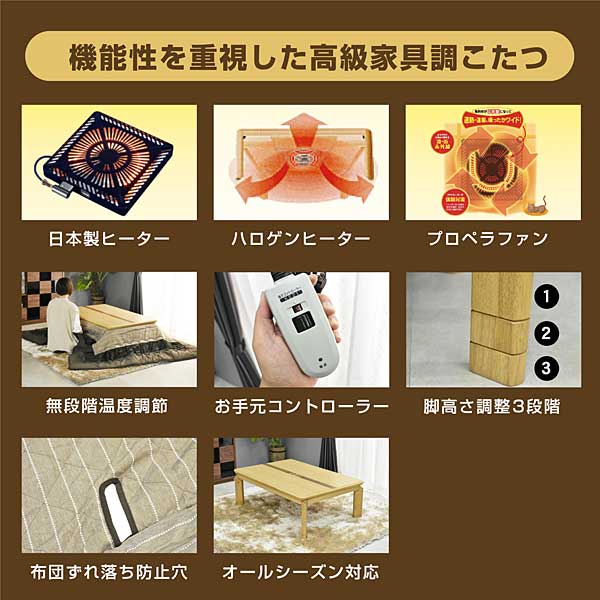 材質・仕様 【テーブル】天板:象嵌入り突板 脚:無垢材 【こたつ掛け布団】ポリエステル サイズ(cm) 【テーブル】W120×D80×高36.5/41.5/46.5(3段階調整) 【こたつ掛け布団】240×200 ヒーターユニット 電源:交流100V 50-60Hz ヒーター:U字型ハロゲンヒーター / ファン・モーター:あり 温度制御:熱源抵抗素子による位相制御 消費電力:【強】600W【弱】90W 温度の目安:【強】約65℃【弱】約42℃ 安全装置:温度ヒューズ133℃ 特徴 【簡単お客様組立て】 ・天板は高級家具調こたつ(象嵌入り突板) ・安心の日本製U字型ハロゲンヒーター、薄型ヒーター採用、即暖2秒 ・手元コントローラーで楽に操作可能 ・冬はこたつ、夏はリビングテーブルとしてオールシーズンお使いいただけます。